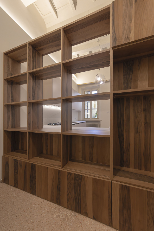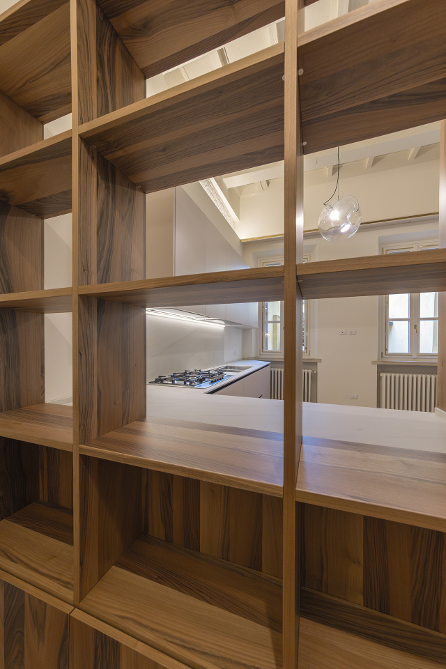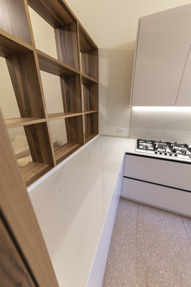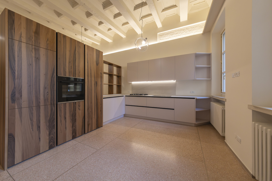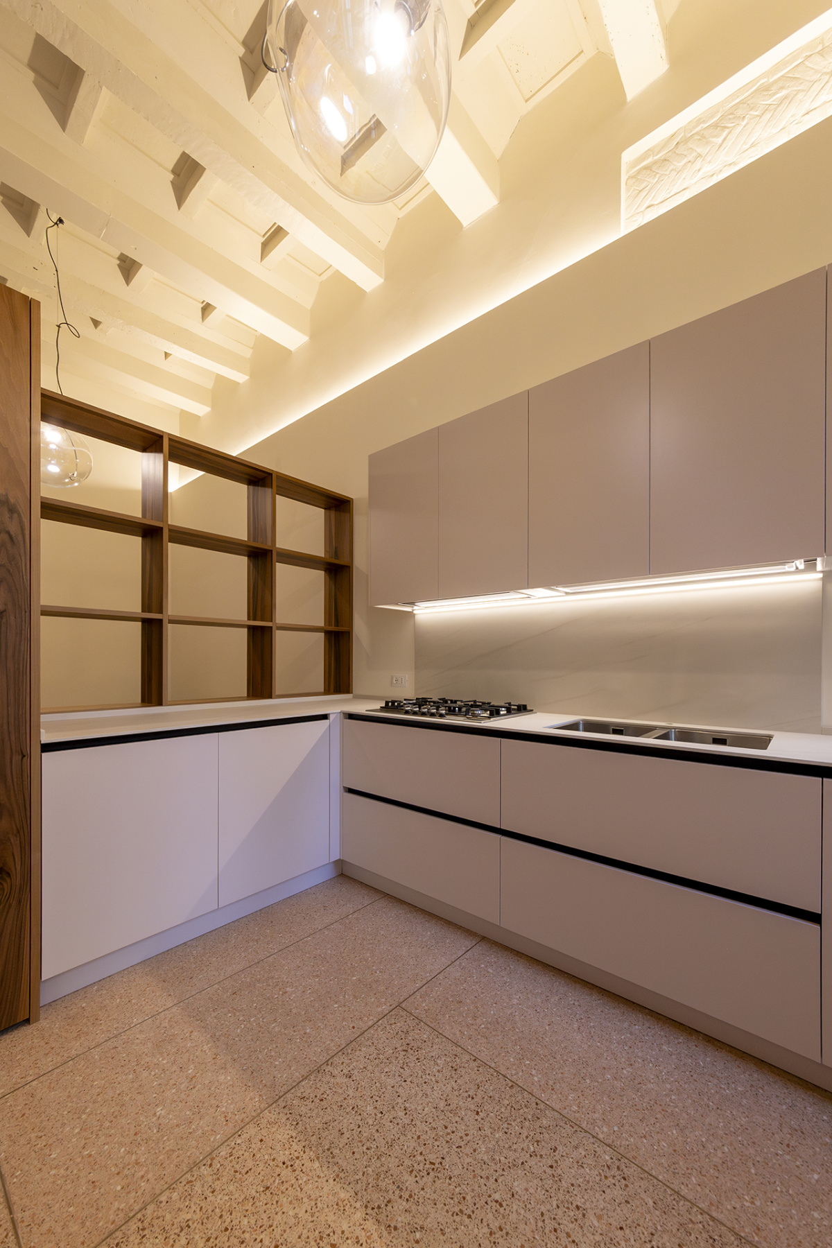 La cucina su misura, cuore pulsante della casa, diventa al tempo stesso spazio di incontro, divisorio e soggiorno.