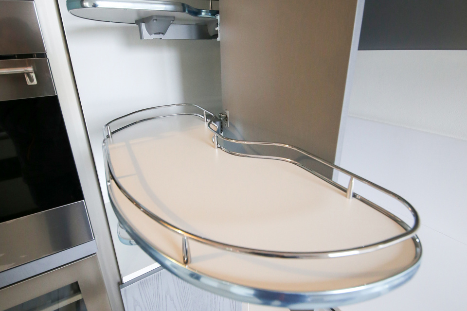 Gli elementi in legno verniciato, messi in risalto da una continuità di venatura, si accostano ad elementi totalmente colorati di bianco ed altri rivestiti in vetro, per dare vita ad una cucina dal design pulito ed essenziale. La presenza consistente di ripiani e cestelli girevoli danno la possibilità di accogliere e organizzare al meglio un considerevole numero di oggetti, garantendo quell'aspetto contenitivo pratico e funzionale che non deve mancare mai in cucina.